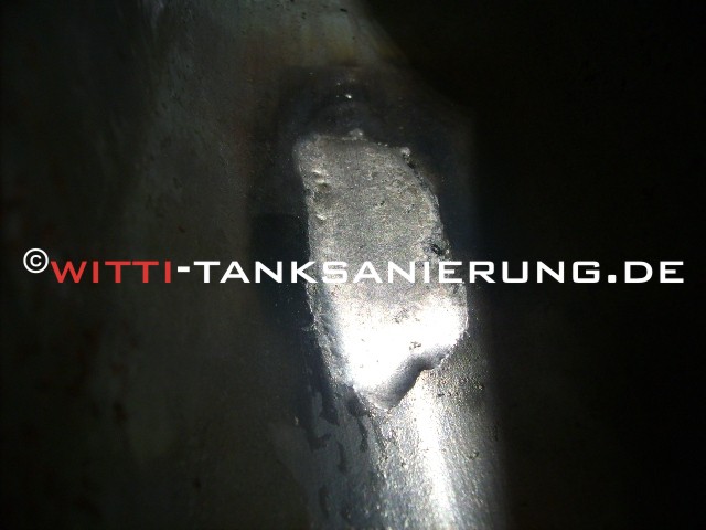 | Der Tank hat im Rahmentunnel mittig einen Riss. | Ergebnis nach verlöten und Dichtigkeitsprüfung. |