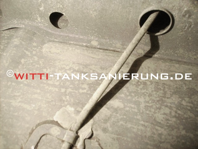 | Korrosion und starke Ablagerungen im Inneren. Der Tank ist durch zwei Schwallbleche in drei Kammern unterteilt. Kammer eins und zwei sind durch den Einfüllstutzen und die Tankgeberöffnung zugänglich. Kammer drei muss durch eine Arbeitsöffnung zugänglich gemacht werden. Bild 1 + 2 jeweils durch die Tankgeberöffnung in Kammer 2, Bild 3 + 4 jeweils durch die Arbeitsöffnung in Kammer 3. |